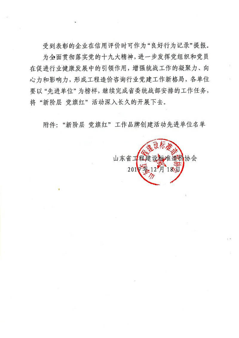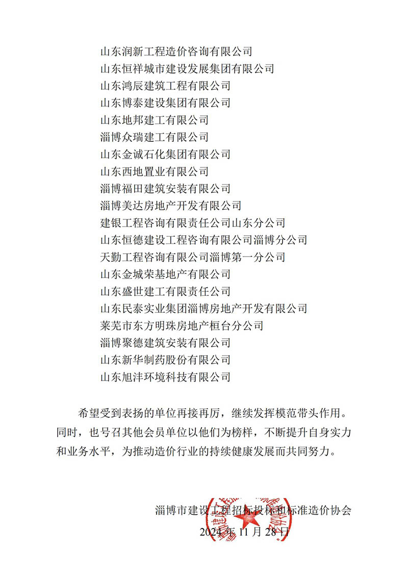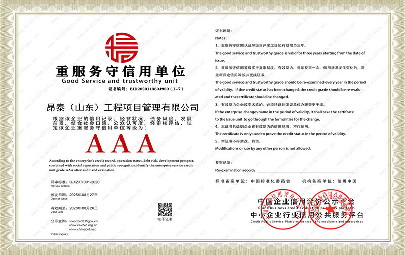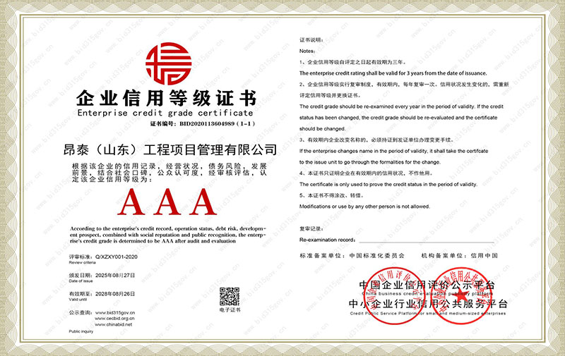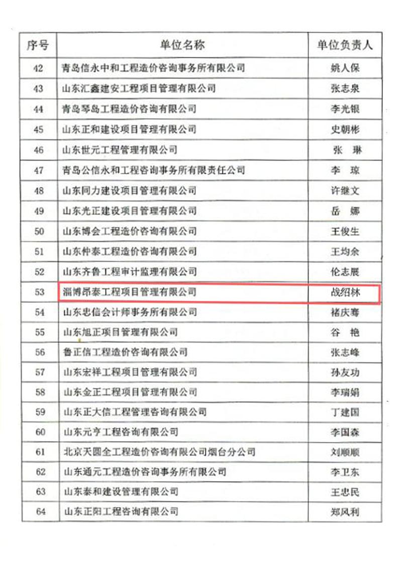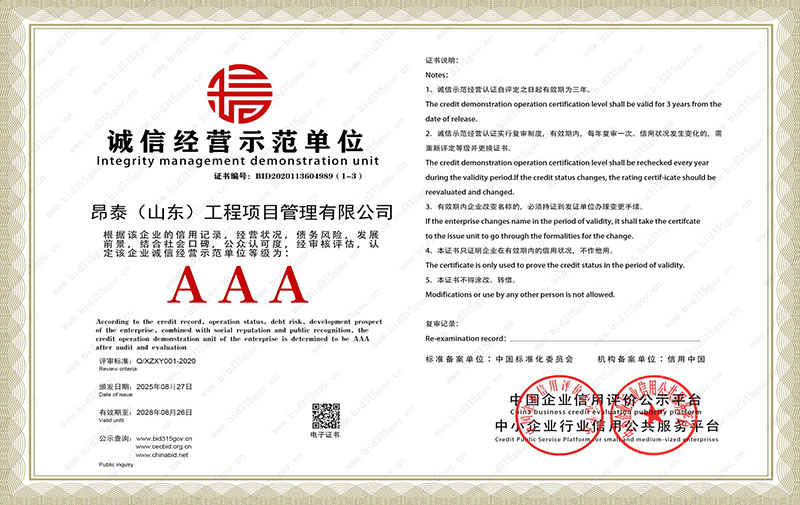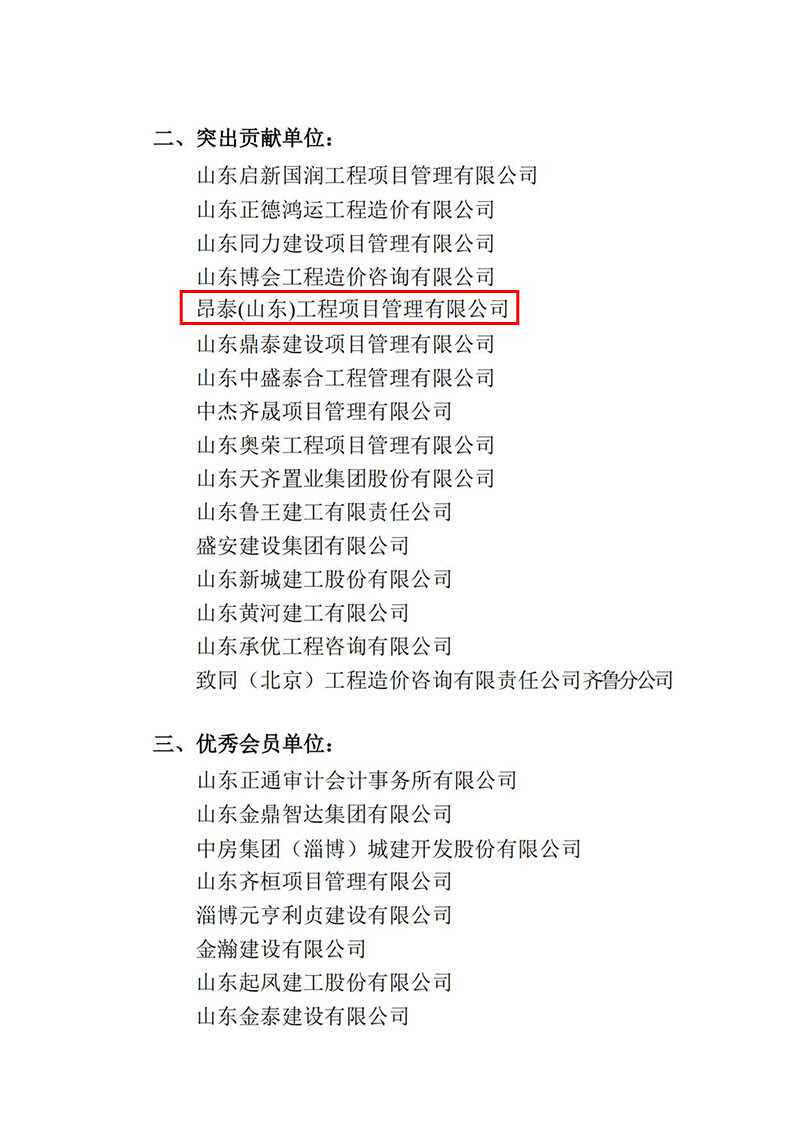 昂泰(山东)工程项目管理有限公司在造价咨询业界取得了多项荣誉和奖项,20多年来,从每一份图纸的细致算量,到每一轮报价的严谨核价;从项目前期的投资估算,到竣工结算的精准把控,昂泰人始终坚信:“差之毫厘,谬以千里”,我们笔下的每一个数字、每一项结论,都牵动着工程的效益与安全。这些荣誉和奖项,正是对我们“把每一个细节抠到极致,把每一次服务做到用心”的最佳见证。以下是该公司获得的一些主要荣誉奖项: